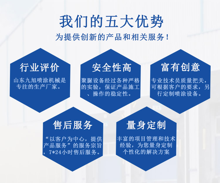 山東九旭機械科技有限公司歷經(jīng)十幾年的發(fā)展,已成長為液壓聚脲設備行業(yè)頗具實力的設備制造業(yè)之一。主要產品:聚氨酯高壓噴涂機、聚氨酯高壓發(fā)泡機、液壓聚脲噴涂設備及設備配件(聚氨酯高壓噴槍、槍嘴、加熱管道、料塊、摩擦副、增壓泵、混合式、提料泵等)也是堅持最好的質量服務用戶,